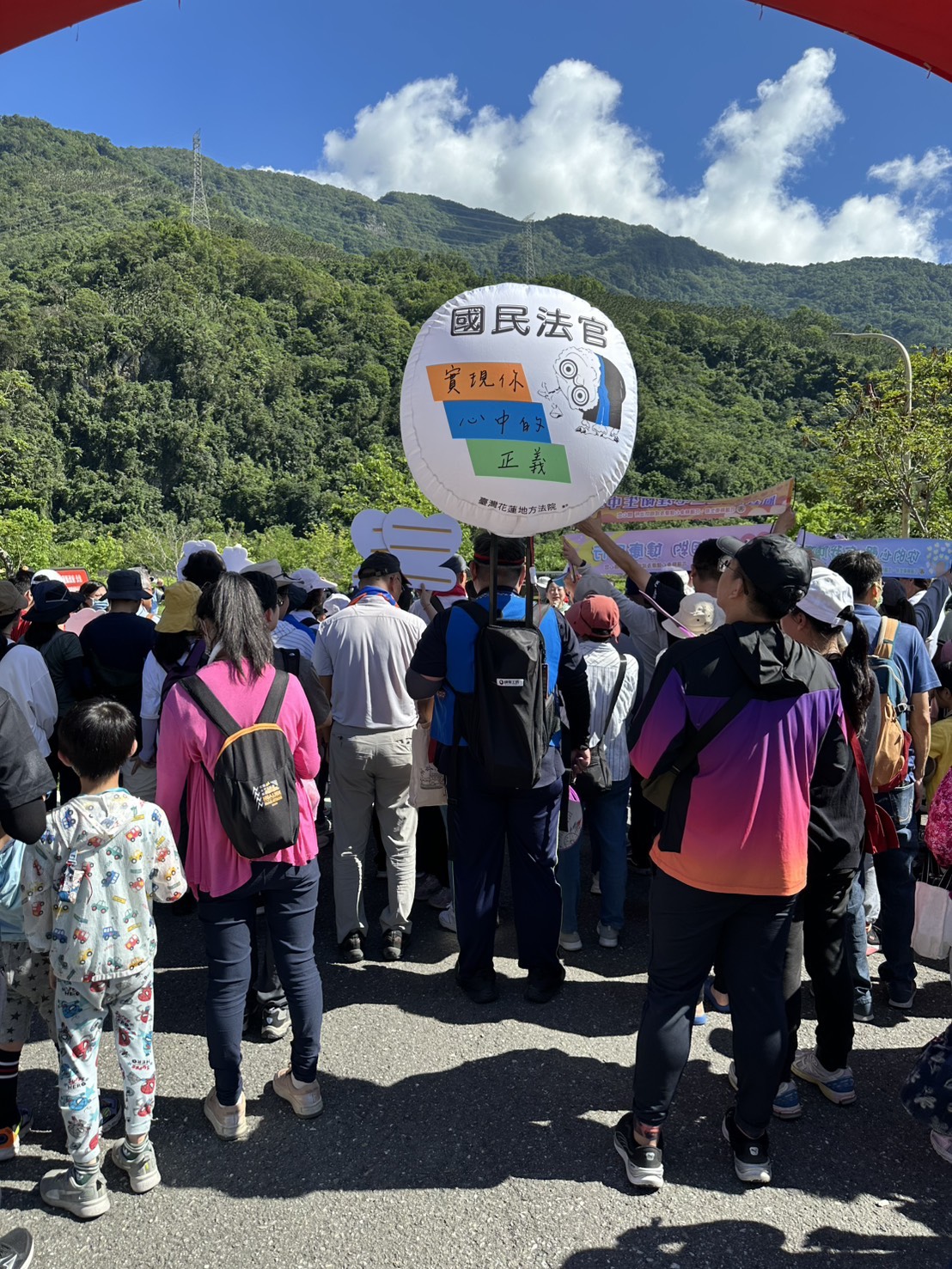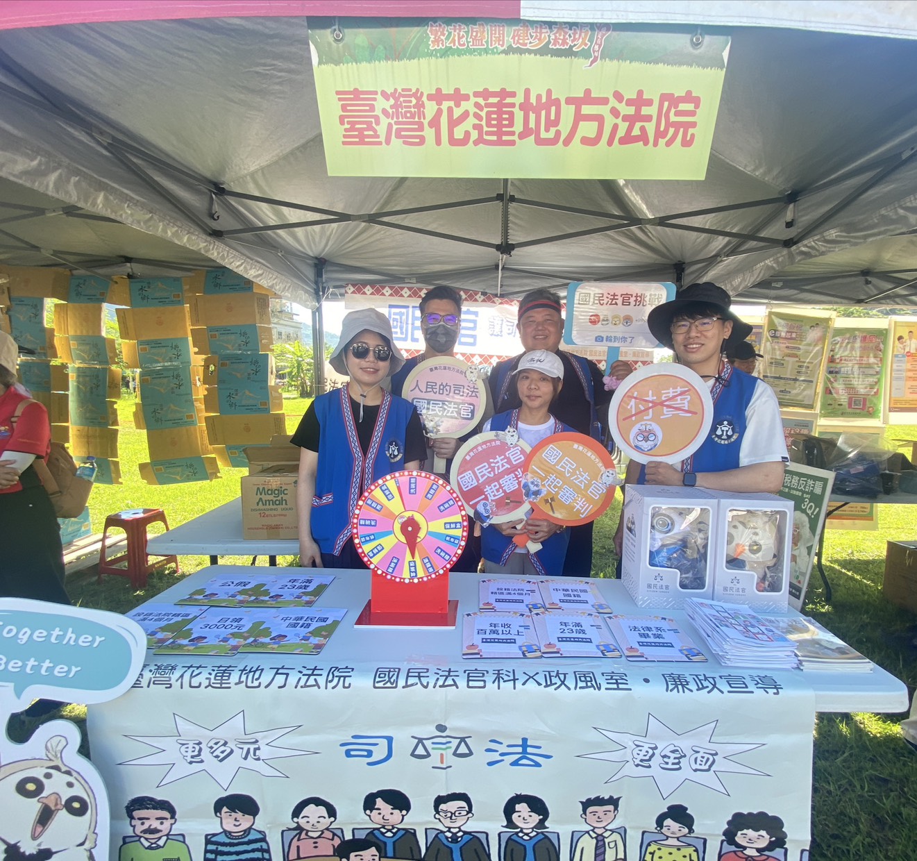 臺灣花蓮地方法院於5月17日參與花蓮縣政府主辦的「繁花盛開 健步森坂」健走活動,活動地點選在風光明媚的林田山林業文化園區,吸引大批民眾熱情響應。本院藉此機會設置宣導攤位,透過結合趣味與教育性的互動遊戲,向民眾推廣國民法官制度,並加強防範詐騙的觀念。
