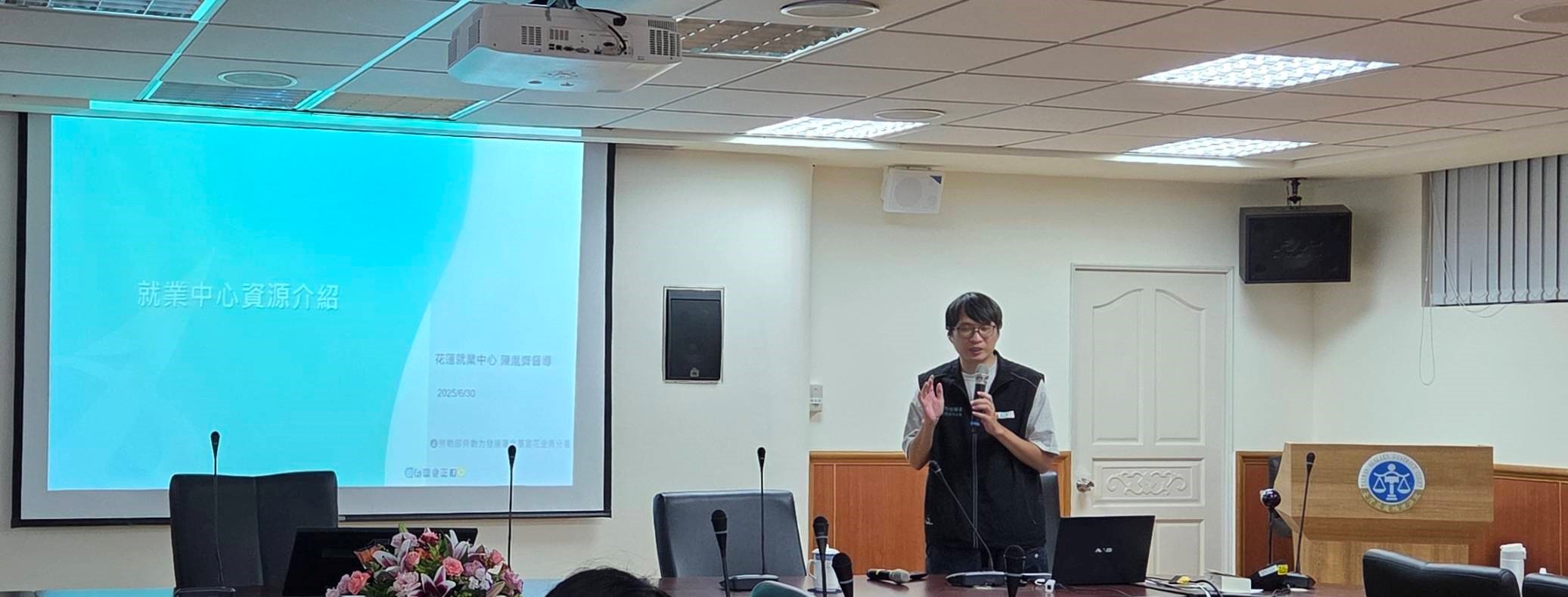 為強化本院同仁對花蓮就業資源及相關補助方案的認識,本院調查保護室特於114年6月30日辦理「就業輔導」專題講座,邀請勞動部勞動力發展署北基宜花金馬分署花蓮就業中心(下稱花蓮就業中心)陳胤齊督導蒞院授課,就青年及跨域專案補助、臨工津貼等多元化就業服務資源進行介紹,以利提升對少年就業的輔導知能。